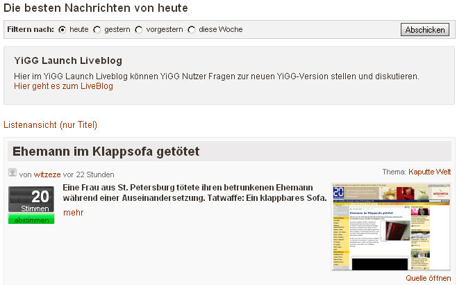 "Nachrichten"-Rubrik der Website www.yigg.de, 12.07.2008